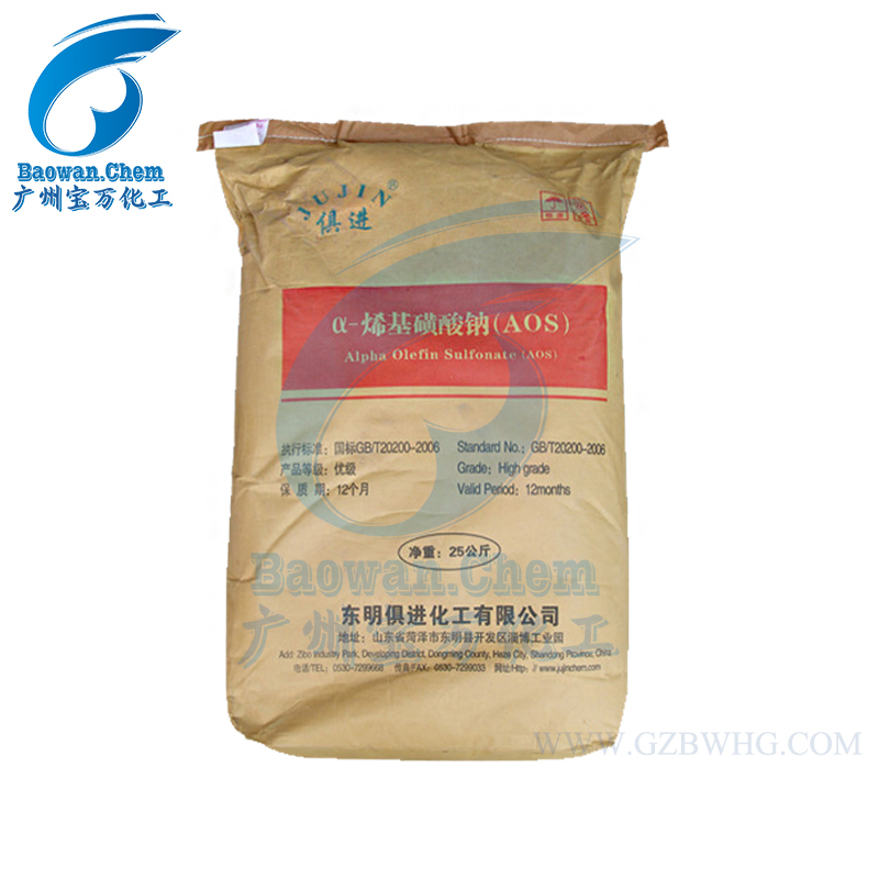 α-烯基磺酸鈉AOS( α-烯烴磺酸鈉 )具有很好的綜合性能。工藝成熟,質量可靠,有很好的去污力,特別在硬水中也顯示出去污力基本不降低的特點。AOS生物降解性好,在日本、韓國、印度、美國等地