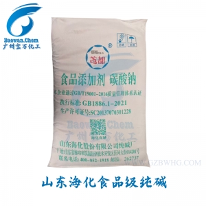 用于食品工業,作中和劑、膨松劑,如制造氨基酸、醬油和面制食品如饅頭、面包等。還可配成堿水加入面食中,增加彈性和延展性。碳酸鈉還可以用于生產味精