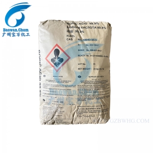 性狀: 白色結晶性粉末或無色微帶珍珠狀光澤的鱗片。無氣味。味微酸苦后帶甜。與皮膚接觸有滑膩感。露置空氣中無變化。能隨水蒸氣揮發。加熱至100-105℃時失去一分子水而形成偏硼酸,于104-160℃時長時間加熱轉變為焦硼酸,更高溫度則形成無水物。0.1mol/L水溶液pH為5.1。1g能溶于18ml冷水、4ml沸水、18ml冷乙醇、6ml沸乙醇和4ml甘油。在水中溶解度能隨鹽酸、檸檬酸和酒石酸的加入而增加。相對密度1.4347。熔點184℃(分解)。沸點300℃。半數致死量(大鼠,經口)5.14g/kg。有刺激性。