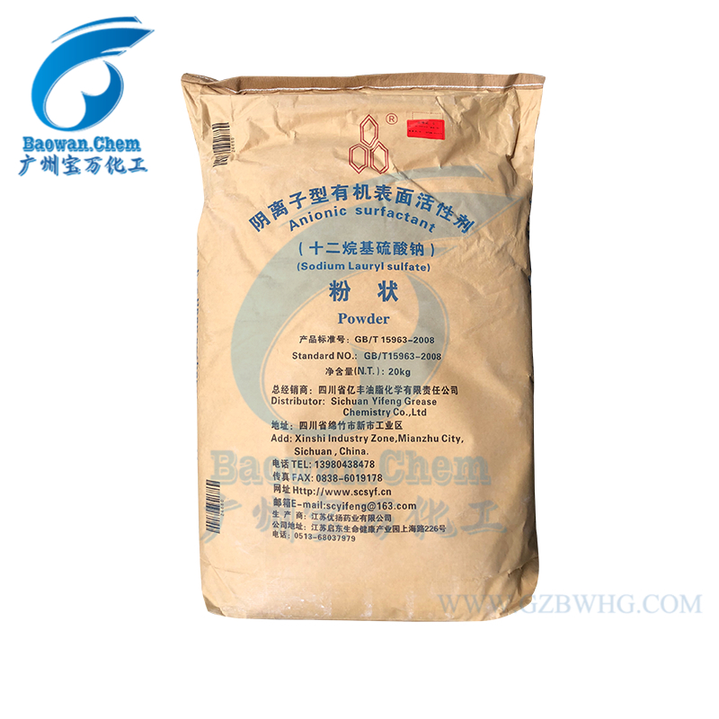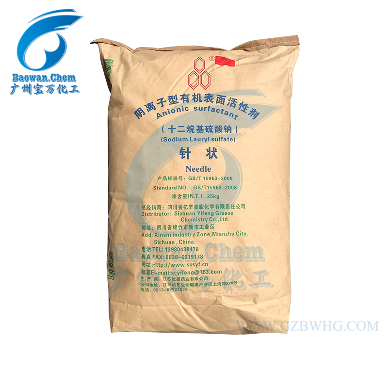 十二烷基硫酸鈉,白色或淡黃色粉狀,溶于水,對堿和硬水不敏感。具有去污、乳化和優異的發泡力。是一種對人體微毒的陰離子表面活性劑。其生物降解度>90%。用途:用作乳化劑、滅火劑、發