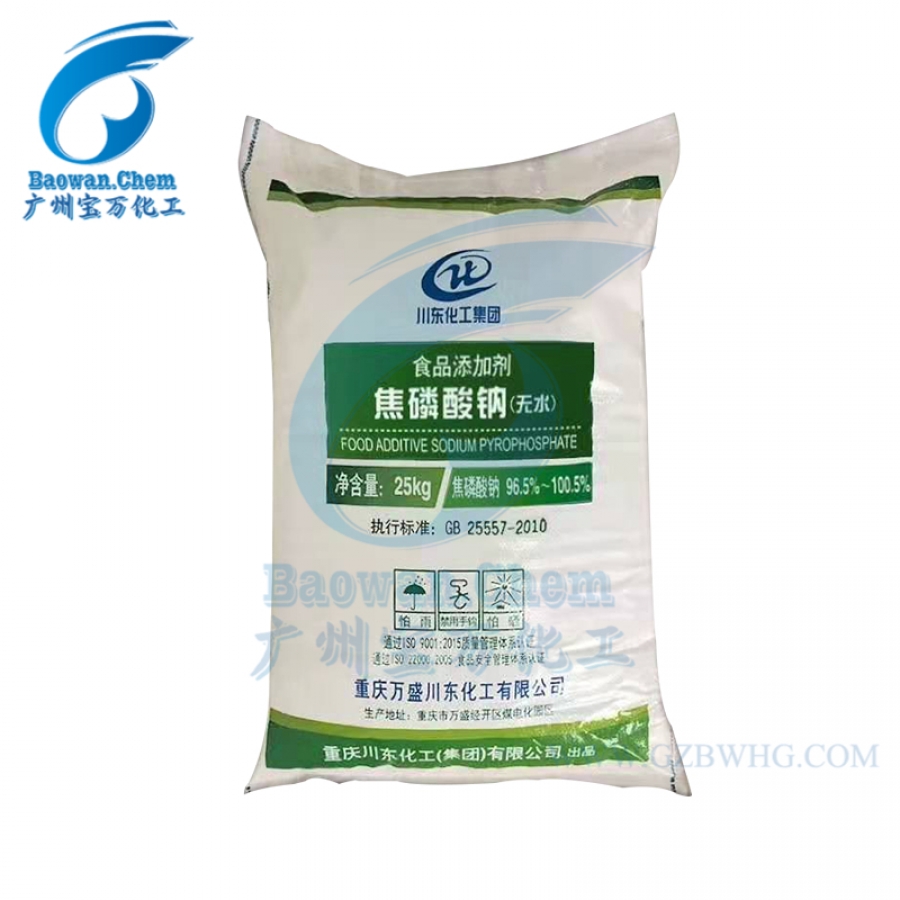 焦磷酸鈉(sodium pyrophosphate),分子式Na4P2O7·10H2O,相對分子質量446.07。又稱二磷酸四鈉,有無水物與十水物之分。十水物為無色或白色結晶或結晶性粉末,無水物為白色粉末,溶于水,不溶于乙醇和其他有機溶劑。與Cu2+、Fe計、Mn2+等金屬離子絡合能力強,水溶液在70℃以下尚穩定,煮沸則水解成磷酸氫二鈉 。