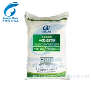 三聚磷酸鈉(sodium tripolyphosphate)分類代碼 GBl5.003,INS451(i)。化學結構:本品為一類無定形水溶性線狀聚磷酸鹽,兩端以Na2 PO4終止,化學式Na5P3 O10,相對分子質量367.86。常用于食品中,作水分保持劑、品質改良劑、pH調節劑、金屬螯合劑  。