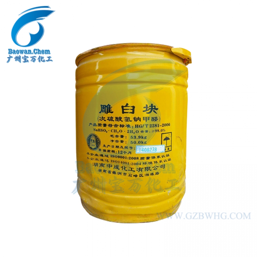 又稱雕白粉,系以福爾馬林結合亞硫酸氫鈉再還原制得,化學名稱為次硫酸氫鈉甲醛或甲醛合次硫酸氫鈉,分子式為NaHS02·CH20·2H20。呈白色塊狀或結晶性粉狀,易溶于水。常溫時較為穩定,高溫下具有極強的還原性,有漂白作用。遇酸即分解,其水溶液在60℃以上就開始分解出有害物質,120℃下分解產生甲醛、二氧化硫和硫化氫等有毒氣體 。