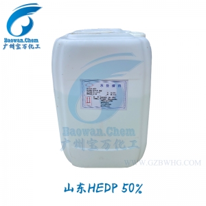 HEDP是一種有機磷酸類阻垢緩蝕劑,能與鐵、銅、鋅等多種金屬離子形成穩定的絡合物,能溶解金屬表面的氧化物。HEDP在250℃下仍能起到良好的緩蝕阻垢作用,在高pH值下仍很穩定,不易水解,一般光熱條件下不易分解。耐酸堿性、耐氯氧化性能較其它有機磷酸(鹽)好。HEDP可與水中金屬離子,尤其是鈣離子形成六圓環螯合物,因而HEDP具較好的阻垢效果并具明顯的溶限效應,當和其它水處理劑復合使用時,表現出理想的協同效應。