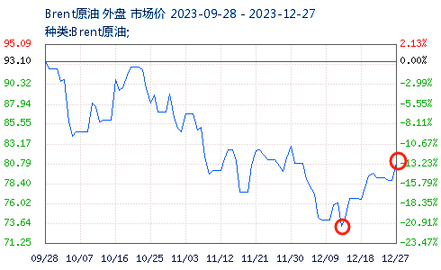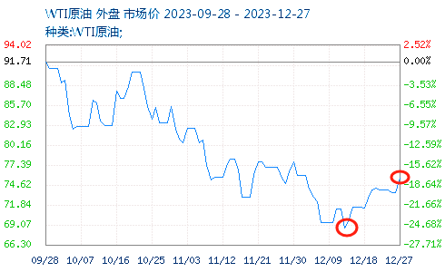 截至2023年(nian)12月27日,布倫特原油報價(jia)80.6美元/桶,較(jiao)12月中旬最(zui)低點上(shang)漲9.65%;WTI原油報價(jia)75.3美元/桶,較(jiao)12月中旬上(shang)漲9%。